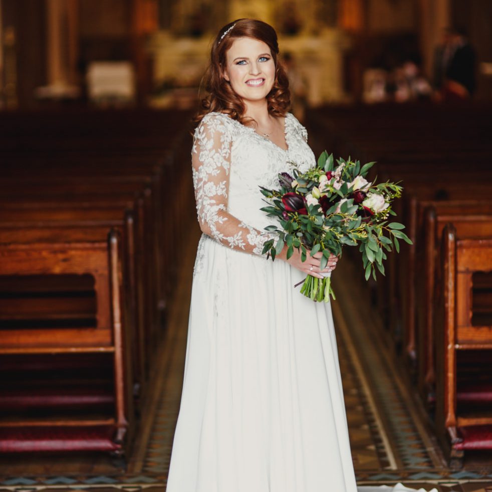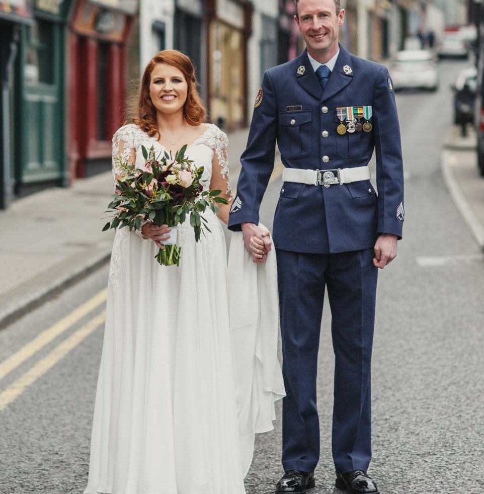 I met Jacinta and Kevin having photographed one of their friends weddings previously. The bridal preparations took place at the family home in the picturesque village of Clones, County Monaghan, working alongside Joanne Connelly Make Up and Hair by Emma. Kevin looked very smart in his Irish Air Corp uniform on arrival at the church. After the service, we decided to take a detour to the main street in Clones, for a few images with its colourful traditional shops as a backdrop…holding up rush hour traffic for a few mins.